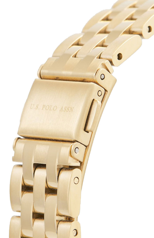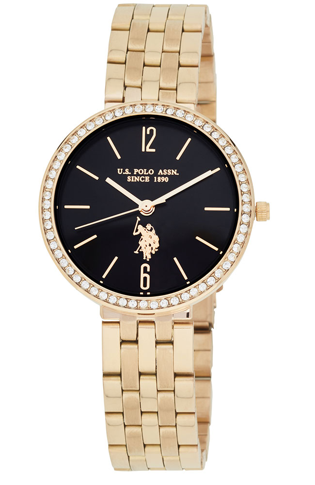Γυναικείο ρολόι U.S. Polo με μαύρο καντράν, πέτρες Ζιργκόν και χρυσό μπρασελέ.