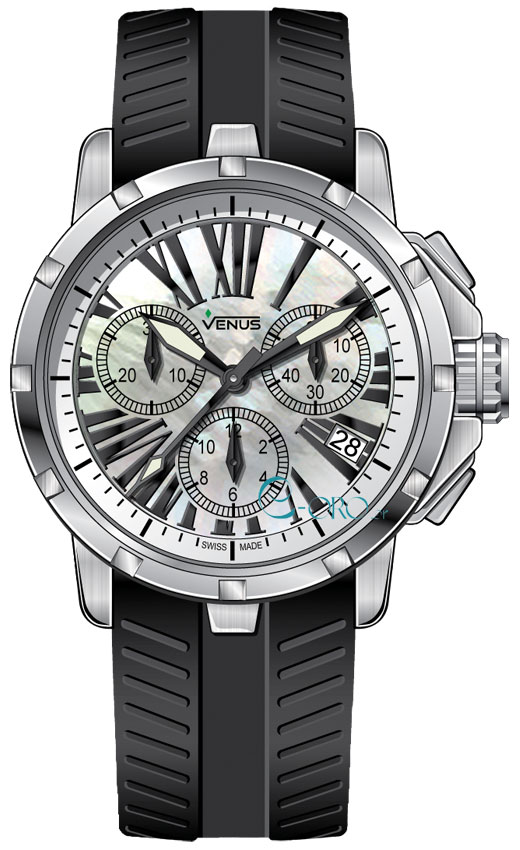 Γυναικείο Ρολόι Χειρός Χρονογράφος Venus ελβετικής κατασκευής από ανοξείδωτο ατσάλι με λευκό φίλντεσι καντράν και μαύρο καουτσούκ λουράκι.