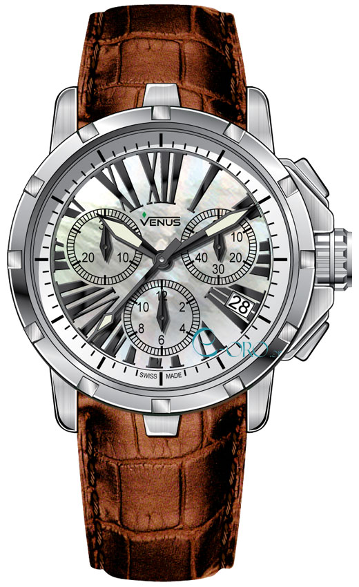 Γυναικείο Ρολόι Χειρός Χρονογράφος Venus ελβετικής κατασκευής από ανοξείδωτο ατσάλι με λευκό φίλντεσι καντράν και καφέ δερμάτινο λουράκι.