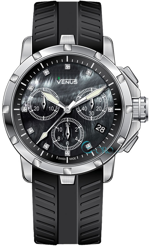 Γυναικείο Ρολόι Χειρός Χρονογράφος Venus ελβετικής κατασκευής από ανοξείδωτο ατσάλι με μαύρο φίλντεσι καντράν, Διαμάντια και μαύρο καουτσούκ λουράκι.