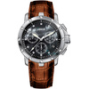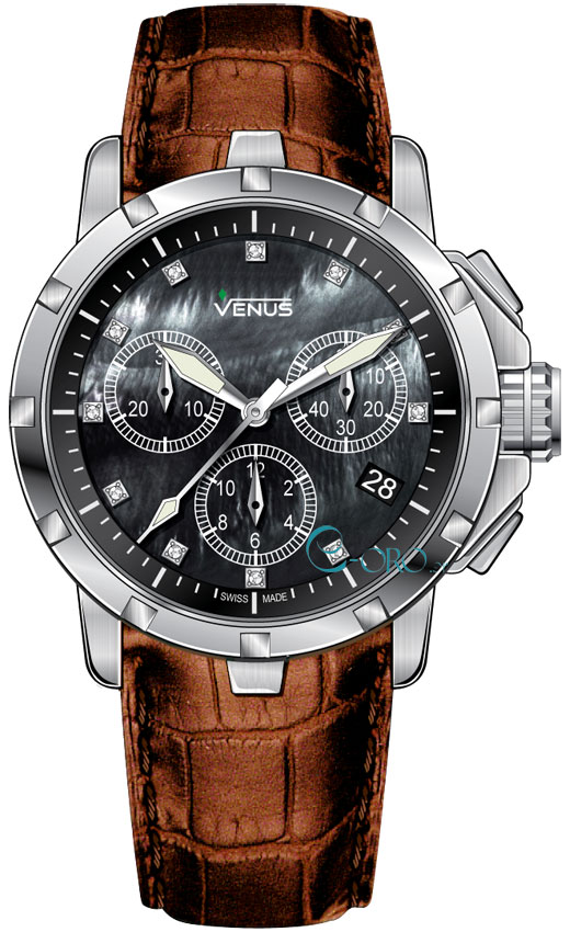 Γυναικείο Ρολόι Χειρός Χρονογράφος Venus ελβετικής κατασκευής από ανοξείδωτο ατσάλι με μαύρο φίλντεσι καντράν, Διαμάντια και καφέ δερμάτινο λουράκι.