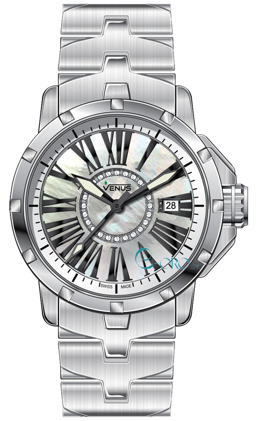 Γυναικείο Ρολόι Χειρός Venus ελβετικής κατασκευής από ανοξείδωτο ατσάλι με λευκό φίλντεσι καντράν, Διαμάντια και μπρασελέ.