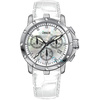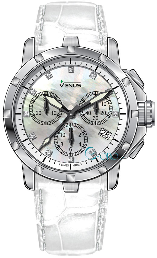 Γυναικείο Ρολόι Χειρός Χρονογράφος Venus ελβετικής κατασκευής από ανοξείδωτο ατσάλι με λευκό φίλντεσι καντράν, Διαμάντια και λευκό δερμάτινο λουράκι.