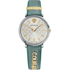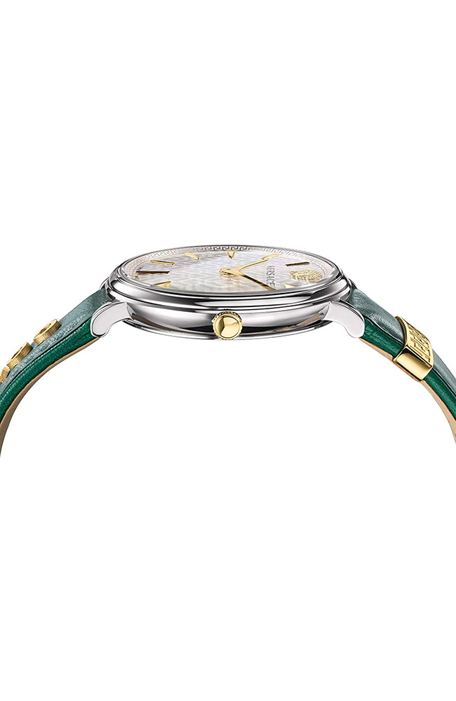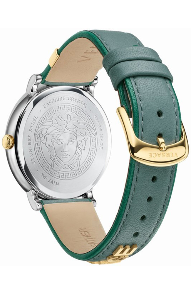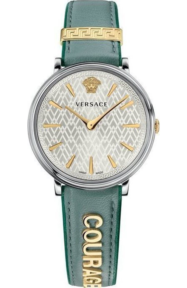 Γυναικείο ρολόι Versace ελβετικής κατασκευής από ανοξείδωτο ατσάλι με ασημί καντράν και δερμάτινο λουράκι.