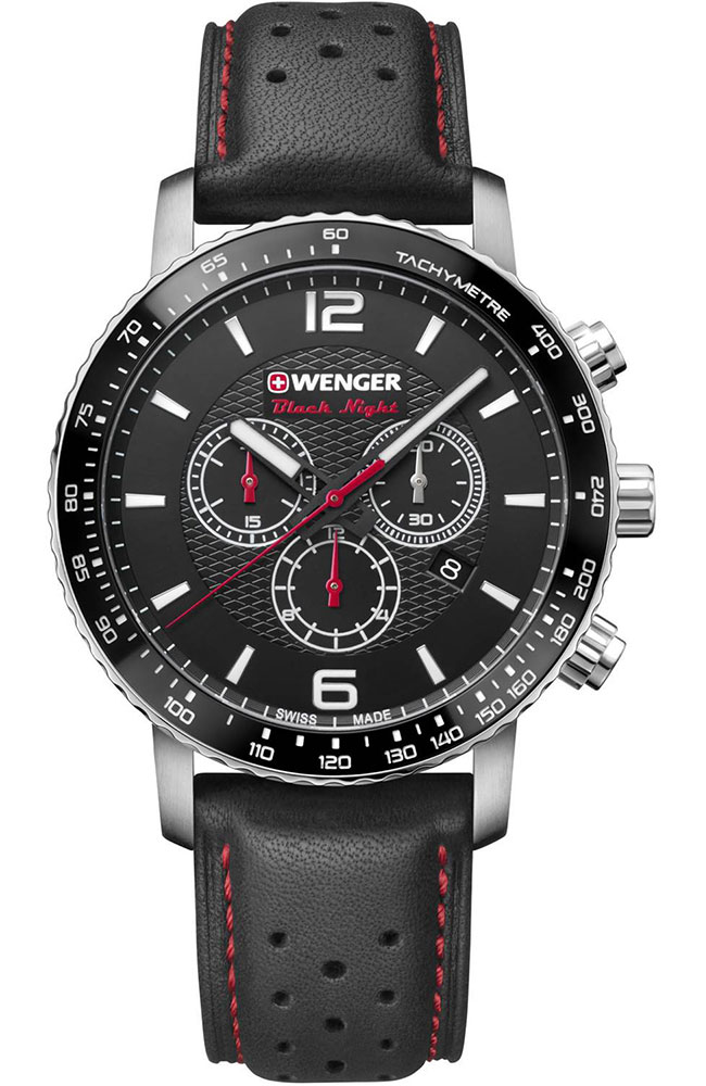 Ανδρικό ρολόι Wenger Ελβετικής κατασκευής από ανοξείδωτο ατσάλι με μαύρο καντράν και μαύρο δερμάτινο λουράκι.