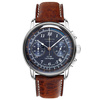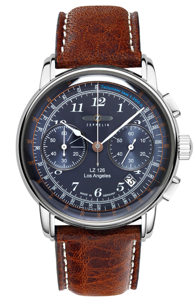 Ανδρικό ρολόι χρονογράφος Zeppelin από ανοξείδωτο ατσάλι με μπλε καντράν και καφέ δερμάτινο λουράκι.