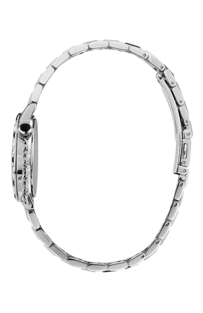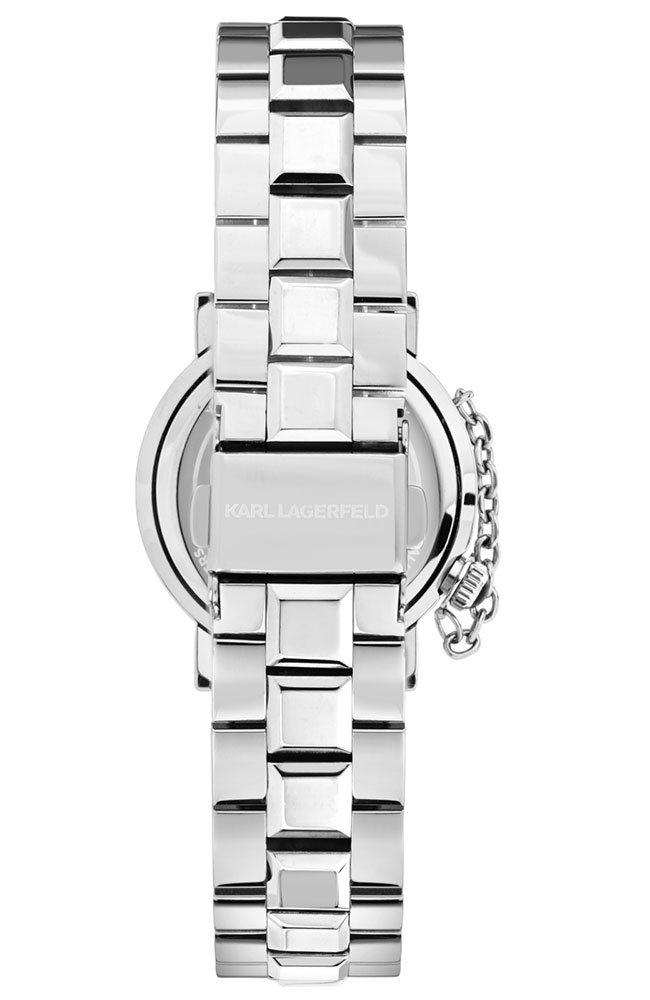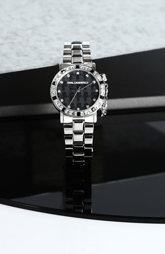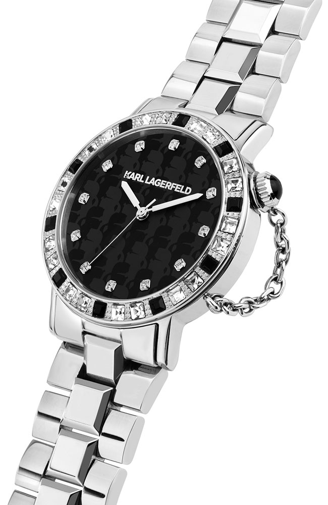 Γυναικείο ρολόι Karl Lagerfeld από ανοξείδωτο ατσάλι με μαύρο καντράν, πέτρες Ζιργκόν και ασημί μπρασελέ.