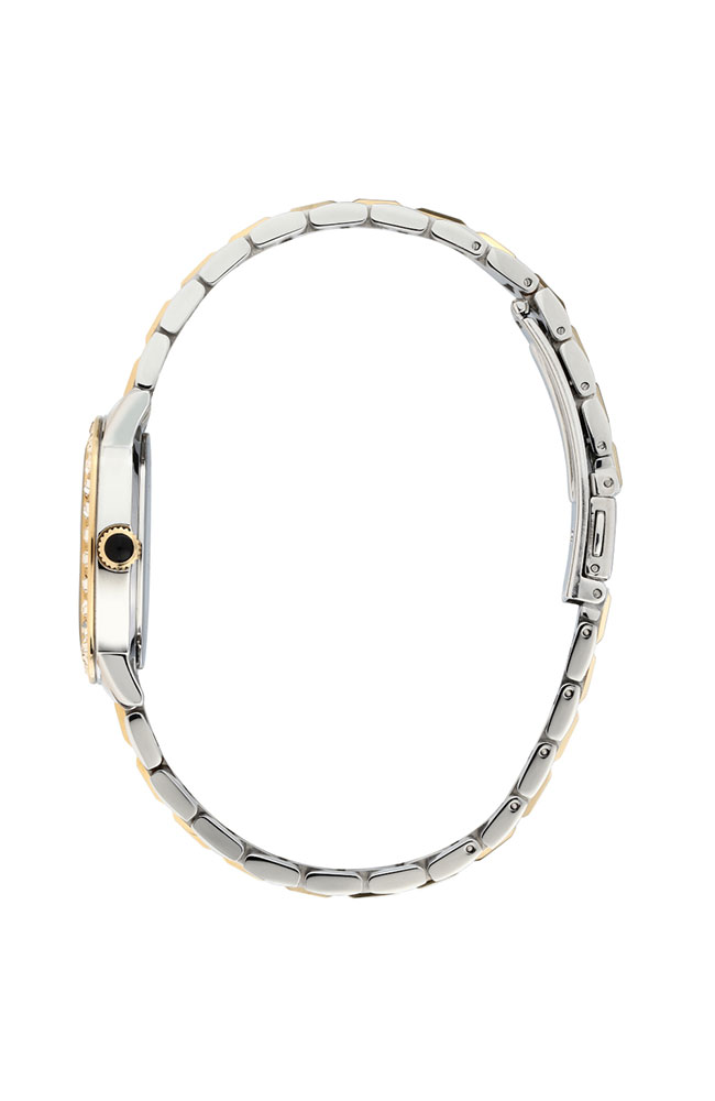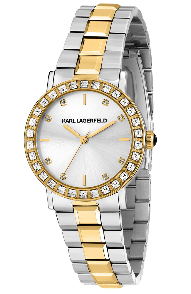 Γυναικείο ρολόι Karl Lagerfeld από ανοξείδωτο ατσάλι με ασημί καντράν, πέτρες Ζιργκόν και δίχρωμο μπρασελέ.