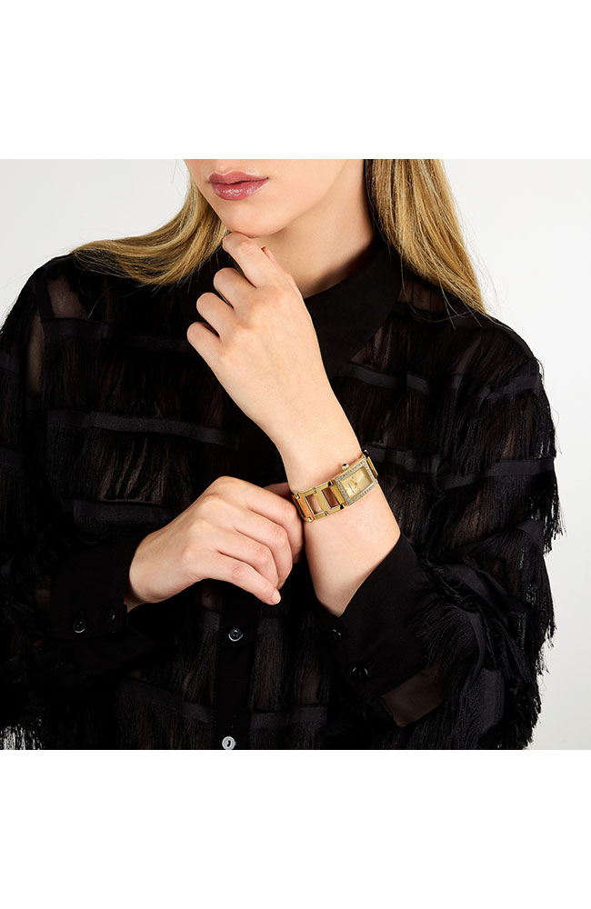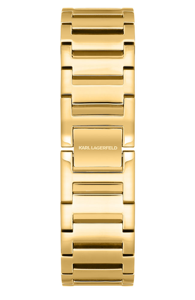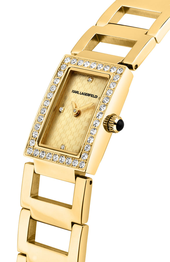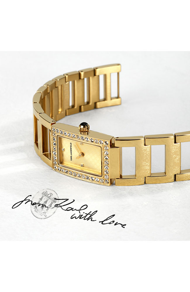 Γυναικείο ρολόι Karl Lagerfeld από επιχρυσωμένο ανοξείδωτο ατσάλι με χρυσό καντράν, πέτρες Ζιργκόν και χρυσό μπρασελέ.